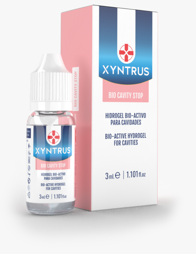 XYNTRUS BIO CAVITY STOP es un material innovador para hidratar, humectar cavidades dentales profundas y/o superficiales, logrando la eliminación de bacterias patógenas residuales luego de una remoción de dentina cariada.
