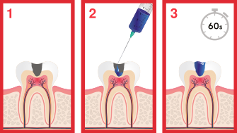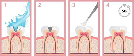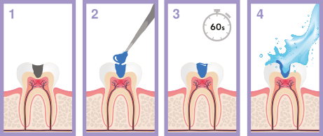 Dejar actuar por 60 segundos. Luego, enjuagar la cavidad con agua hasta eliminar el producto de la cavidad, la que quedará preparada para continuar con la técnica de restauración a elección del odontólogo.