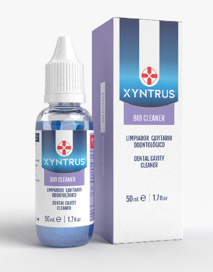 XYNTRUS BioCleaner, es un limpiador cavitario biocompatible de última generación, que además hidrata y humecta cavidades profundas o superficiales. Se trata de una solución acuosa que actúa como solvente orgánico de las estructuras celulares y matrices orgánicas de la dentina.
